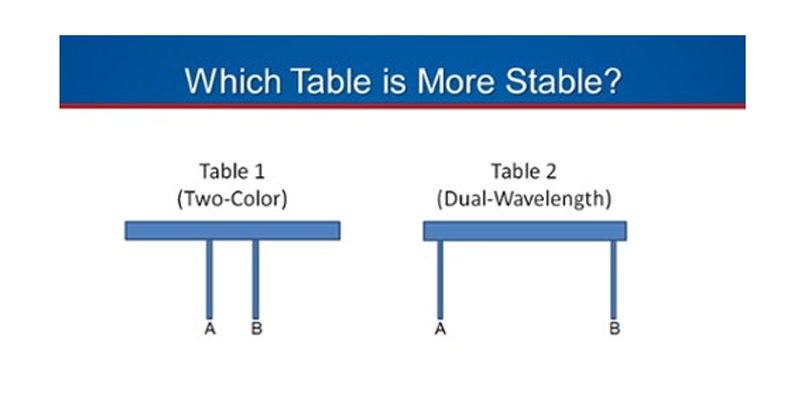 • Just like legs on a table, a ratio pyrometer is more stable when the legs (wavelengths are farther apart