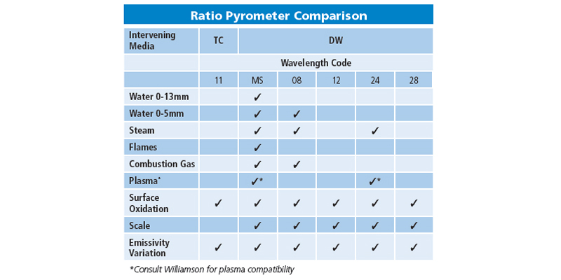 Both Two-Color and Dual-Wavelength pyrometers can compensate for emissivity variation, slight surface oxidation, and moderate misalignment. But as the chart indicates, Dual-Wavelength sensors have many more capabilities when it comes to dealing with common industrial interferences. With the ability to choose from five different wavelength combinations, the Dual-Wavelength technology allows you to select the wavelength set appropriate for your own application conditions.